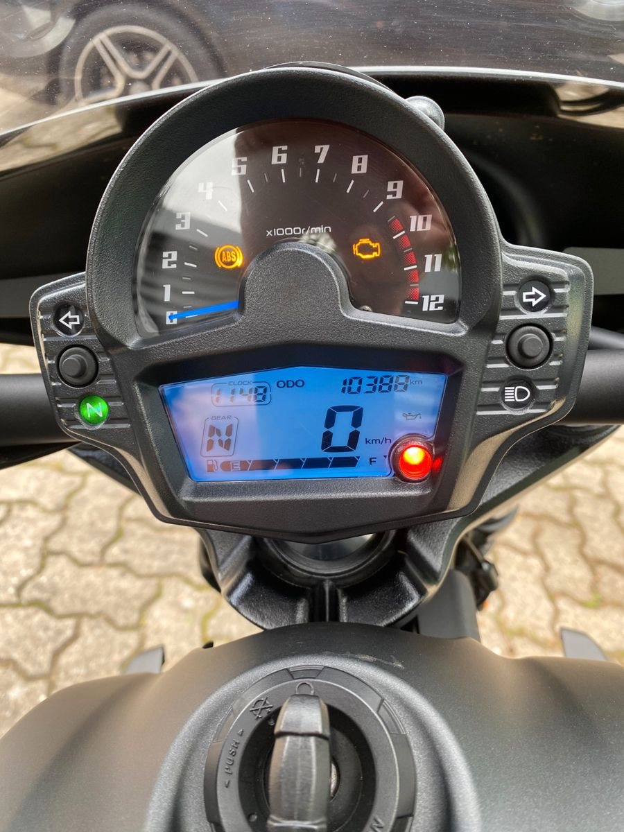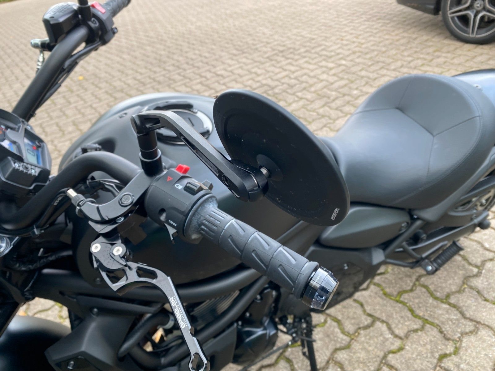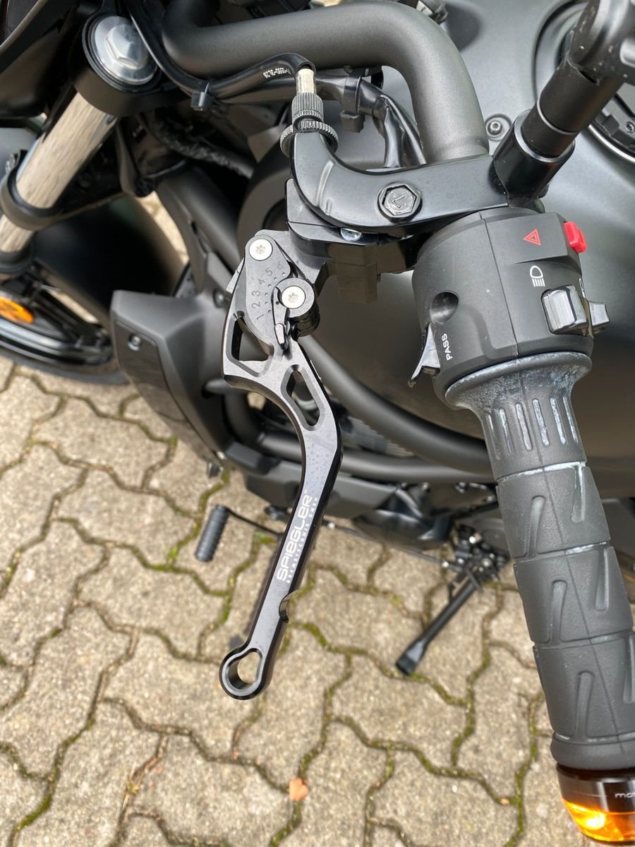 Das Fahrzeug ist ausgestattet mit der Batwing Lenkerverkleidung, Spiegel Montana, Keller Atto Blinkern hinten(Brems-,Rücklicht;Blinkfunktion), Lenkerendenblinkern Mo.Blaze, Brems.-u.Kupplungshebel Spiegler Tusker schwarz,